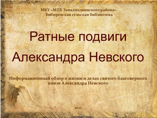 Святой благоверный князь Александр Невский - оставил в российской истории память о себе как о мудром дипломате и отважном полководце. 800-летию князя, которое отмечается в России в 2021 году, Бибиревская библиотека посвятила слайд-шоу о жизни и делах Александра Невского.