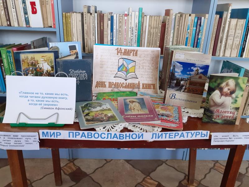 14 марта ежегодно православными христианами России отмечается. День православной книги. Этот праздник был установлен 25 декабря 2009 года решением Священного Синода Русской православной церкви и по инициативе Патриарха Московского и всея Руси Кирилла. Приурочен он к дате выхода 1 марта (14 марта) 1564 года первой печатной книги на Руси – «Апостола» Ивана Федорова. К этому дню в библиотеке для читателей подготовлена книжная выставка "Мир православной литературы". День православной книги направлен на популяризацию не самой по себе книги, а именно ее чтения. Книги издают и приобретают не для того, чтобы ставить их на полку для красоты, а для обогащения своего внутреннего мира.