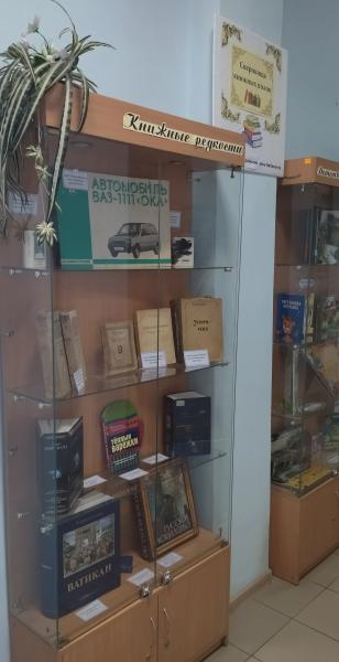 Своеобразным поздравлением для всех посетителей стала выставка, представленная в фойе библиотеки "Сокровища книжных полок". В витринах условно представлены два ее раздела - "Книжные сокровища" и "Детство с книгой".