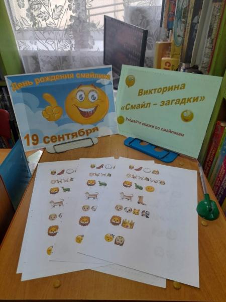 Каждый год 19 сентября отмечается необычный праздник — День рождения дружелюбного электронного символа — День рождения Смайлика. Цифровой смайлик появился на свет (19 сентября 1982 года) для того, чтобы человек мог выразить эмоции, не прибегая к помощи слов. 19 сентября в течении дня на абонементе детской библиотеке проходила викторина посвященная дню рождения Смайлика " Смайл-загадки". Юным читателям нужно было разгадать зашифрованные сказки из смайликов. Ребята с интересом выполняли задания и получали призы.