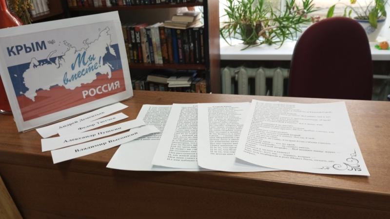 Накануне этого события в Центральной библиотеке прошла акция "Мы вместе, Крым". Литературная акция предлагала всем посетителям библиотеки вспомнить произведения российских поэтов, где упоминается Крым. Четыре стихотворения необходимо было сопоставить с их авторами: Александром Пушкиным, Федором Тютчевым, Владимиром Высоцким и Андреем Дементьевым. Акцию сопровождала книжная выставка "Крым - частичка России".