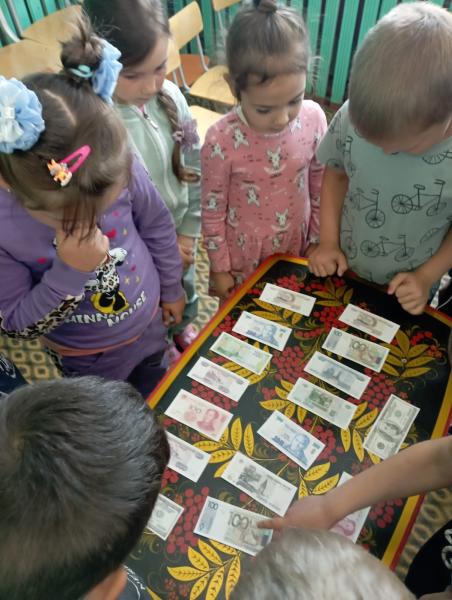 Затем познакомились с денежными знаками нашей страны. Внимательно рассмотрев монеты и купюры, дети убедились, что от подделок их защищают водяные и рельефные знаки. Ребята сравнили их по разным признакам, найдя две стороны у монет и купюр. В заключении дети посмотрели мультфильм о том, как появились деньги, что их заменяло в древние времена.