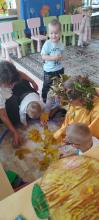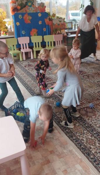 Осень пришла в детский сад и подарила воспитанниками подарочек, каравай (а роли Осени библиотекарь). Дети же отблагодарили гостью песнями и танцами, прочитали осенние стишки и отгадали все загадки, сыграли в игры, показав свою ловкость и внимательность.