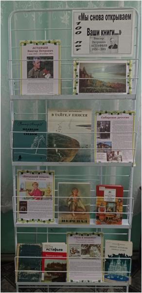 В этом году исполняется 100 лет со дня рождения Виктора Петровича Астафьева – известного советского и российского писателя, фронтовика, мастера деревенской и военно-патриотической прозы. Для учащихся 6б класса СОШ №1 было проведено мероприятие «С любовью к Виктору Астафьеву» , посвященное юбилею писателя. С помощью презентации библиотекарь познакомила ребят с биографией и творчеством В. Астафьева, который рано остался без родителей, беспризорничал, воевал в годы Великой Отечественной войны, был ранен, награжден орденами и медалями. С помощью книжной выставки «Мы снова открываем Ваши книги…» для ребят была проведена квест – игра с загадками по произведениям Васюткино озеро» и «Конь с розовой гривой», вспомнили и такие рассказы писателя как: " Капалуха" и "Деревья растут для всех".