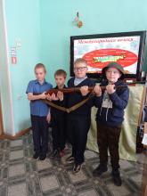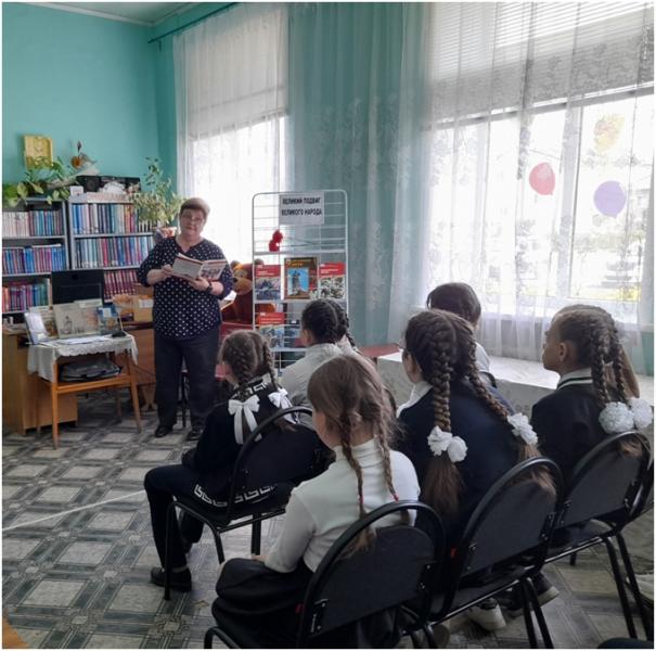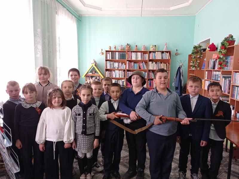 В начале мероприятия детям рассказали об этом великом празднике - Дне Победы, о проходящей по всей России Акции, участниками которой являются и они.Для громкого чтения были выбраны рассказы Анатолия Митяева, 100 –летие которого мы отмечаем в этом году. Ребята с интересом прослушали военную биографию писателя Анатолия Васильевича Митяева. Он сам участвовал в Великой Отечественной войне, был ранен, контужен, поэтому так любил героев своих рассказов – ведь это его фронтовые товарищи. Для чтения вслух были выбраны рассказы о войне «Серьги для ослика», «Землянка» и «Отпуск на 4 часа». Затем ребята ответили на вопросы библиотекаря о прочитанных рассказах. В библиотеке оформлена книжная выставка «Великий подвиг великого народа». Здесь представлены книги, рассказывающие о подвиге советского народа в ходе Великой Отечественной войны. Но больше всего ребятам понравилось фотографироваться в настоящей солдатской каске и с винтовкой. В заключение мероприятия детям были вручены буклеты со списком книг о войне.