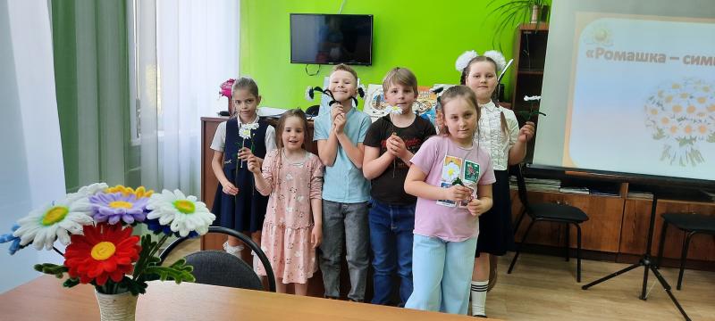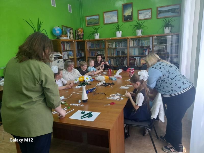 Этот цветок ребята вместе с родителями изготовили в ходе мастер-класса. Опытная рукодельница, а также сотрудник Центральной библиотеки - Ирина Владимировна Петрова, продемонстрировала как быстро и просто создать ромашку из синельной проволоки. При ее участии яркий букет ромашек был создан присутствующими семьями. Свои поделки они забрали с собой, чтобы подарить родным и близким.