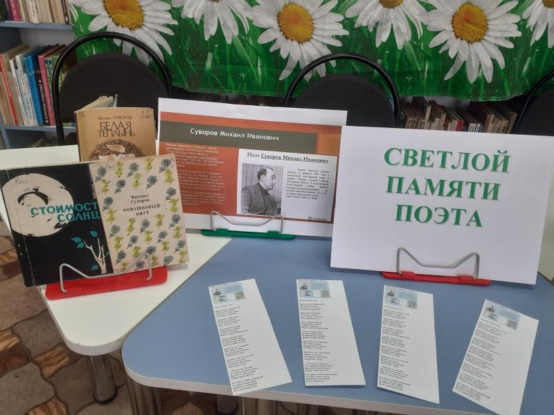 В рамках Акции библиотека провела литературный час "Ромашковый омут", названный по одноимённому стихотворению Михаила Суворова. Пользователей познакомили с биографией поэта. Участники акции прочитали его стихи. В библиотеке оформлена выставка "Светлой памяти поэта". Для присутствующих подготовлены закладки с произведениями автора.