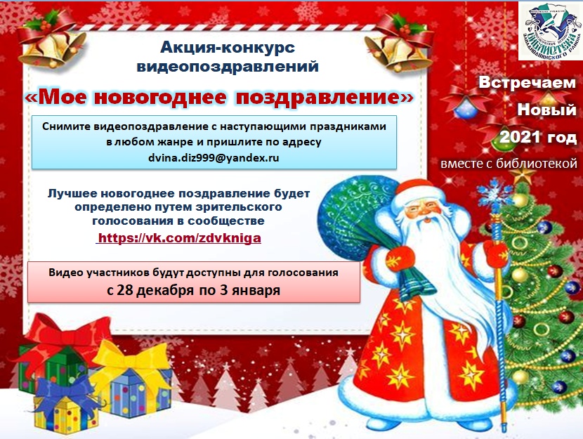До 25 декабря 2020 года снимите двухминутное видео с новогодним поздравлением в любом жанре (песня, проза, стихотворение, танцевальный номер, игра на музыкальном инструменте и т.д.). Можно использовать карнавальные костюмы и новогодние атрибуты.