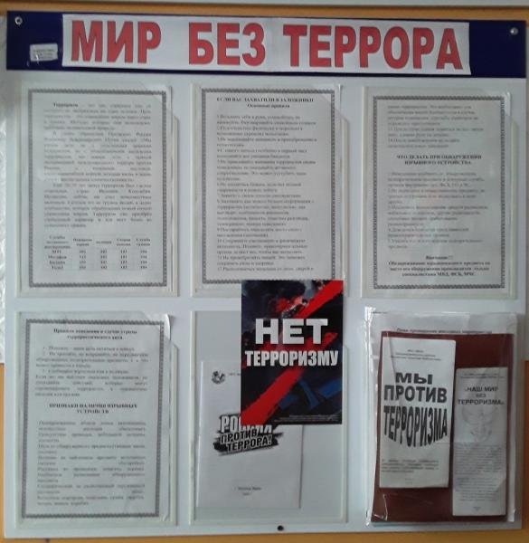 -Сотрудник Ильинской библиотеки посетила школу, где с учащимися была проведена беседа «Терроризм – проблема современности». Школьников познакомили с понятием "терроризм", рассказали о трагедиях, произошедших в нашей стране в разное время. Сделали акцент на том, почему так важно соблюдать правила поведения в экстремальных ситуациях и вручили памятки «Как не стать жертвой теракта?» и «Как вести себя в заложниках?». Этой же теме посвящен информационный стенд "Мир без террора", оформленный в стенах библиотеки оформлен стенд.