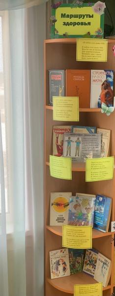 В библиотеке для читателей оформлена выставка « Маршруты здоровья», где представлены книги о профилактике ЗОЖ