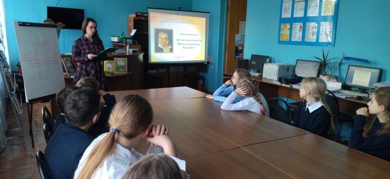Более 30 лет Крылов служил библиотекарем, работал над различными библиографическими списками, но запомнился потомкам как выдающийся писатель, баснописец. Основным вехам его биографии был посвящен занимательный кроссворд, который школьники отгадывали в завершении встречи. Закончилось мероприятие просмотром мультфильма по одному из произведений писателя.