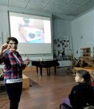 Ребята подержали в руках плёнку и увидели, как настраивают объектив фильмоскопа (прообраза проектора) и заряжают пленку с диафильмом. И вот происходит настоящее чудо. Тихий гул проектора-фильмоскопа и яркий луч превращают стену в волшебный экран, на котором сменяют друг друга цветные картинки...