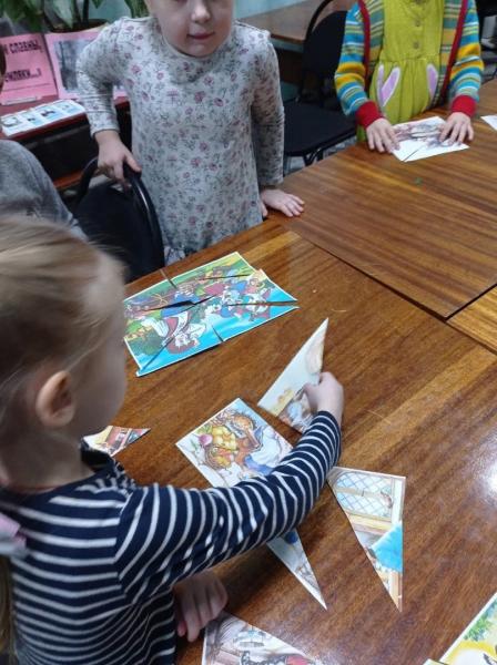 Дети вспоминали сказки Перро : "Красная шапочка", " Золушка", "Спящая красавица", "Кот в сапогах" и играли в различные игры: "Сказка на внимание», « Ленты», «Веретено», собирали пазлы. Смотрели отрывок мультфильма "Кот в сапогах".