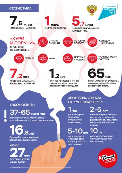 По данным официальной статистики РФ, за годы действия государственной политики, направленной на защиту граждан от табачного дыма и последствий потребления табака, распространенность курения в стране неуклонно снижается, правда, за последние годы наблюдается замедление темпов снижения распространенности курения и прирост потребления иной никотинсодержащей продукции: вейпов, электронных сигарет, продуктов нагревания табака, кальянов и бездымного табака.