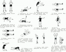 • При постельном режиме больной может заниматься физкультурой лежа, при улучшении состояния — сидя. При этом в комплекс включают простые упражнения без отягощения для крупных мышечных групп туловища, ног и рук, а также дыхательные упражнения. Все движения в случае постельного режима следует выполнять с неполной амплитудой и небольшим мышечным напряжением.