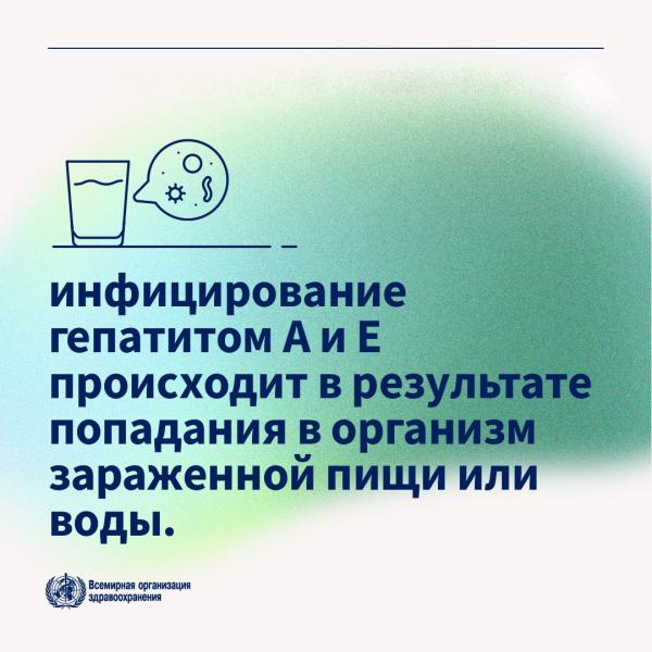 Гепатиты вызванные вирусами А и Е передаются через инфицированные пищевые продукты и воду. Гепатит Е может вызывать смерть у 20% беременных женщин.