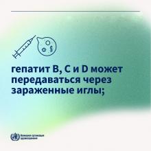 Гепатиты В, С и D в совокупности являются наиболее частой причиной смерти, ежегодно унося жизни 1,4 млн. человек. Вирусы гепатитов В, С и D находятся в большом количестве в крови и других биологических жидкостях инфицированного человека. Заражение чаще всего происходит, когда кровь инфицированного человека попадает в кровь или на поврежденную кожу (слизистые оболочки) другого человека. Для заражения нужны видимые следы крови.