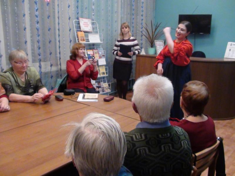 Колыбельные, любовные, семейные песни, жестокие романсы, как жанр, спетые ею в традиционной протяжной манере покорили слушателей. Отдельной темой вечера стала частушка, короткие, хлесткие четыре строки ее текста способны были метко описать события, происходившие в жизни человека. Об истории и жанрах частушки, собравшимся рассказала председатель клуба Светлана Тимофеева.