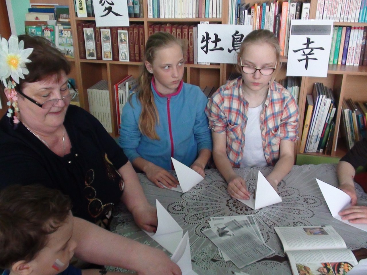 Необычная форма мероприятия и вечернее время его проведения, как и в прежние годы, вызвали у гостей особый интерес. Всех пришедших в библиотеку ждало путешествие по Японии с использованием видеосюжетов и презентации, мастер – класс «Оригами», делали японского журавлика под рассказ и песню о девочке Садако.