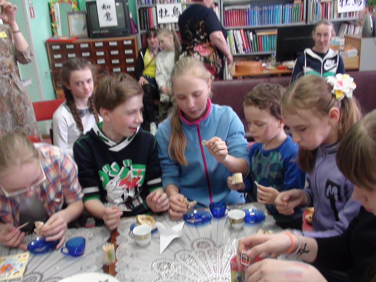 Потом все перебрались на поляну японских сказок, где все послушали сказки «Ивовый прутик» и «Кувшинный человек», приняли участие в отгадывании японских хокку, за правильные ответы вручали сувениры. А в фойе на протяжении всего вечера работал Тату-салон, где все желающие могли нарисовать себе на память о вечере японские иероглифы. В этот вечер для всех, кто пришёл в библиотеку, работало кафе, в меню которого были сладкие роллы. Вечер понравился гостям. До встречи на «Библиосумерках -2019».