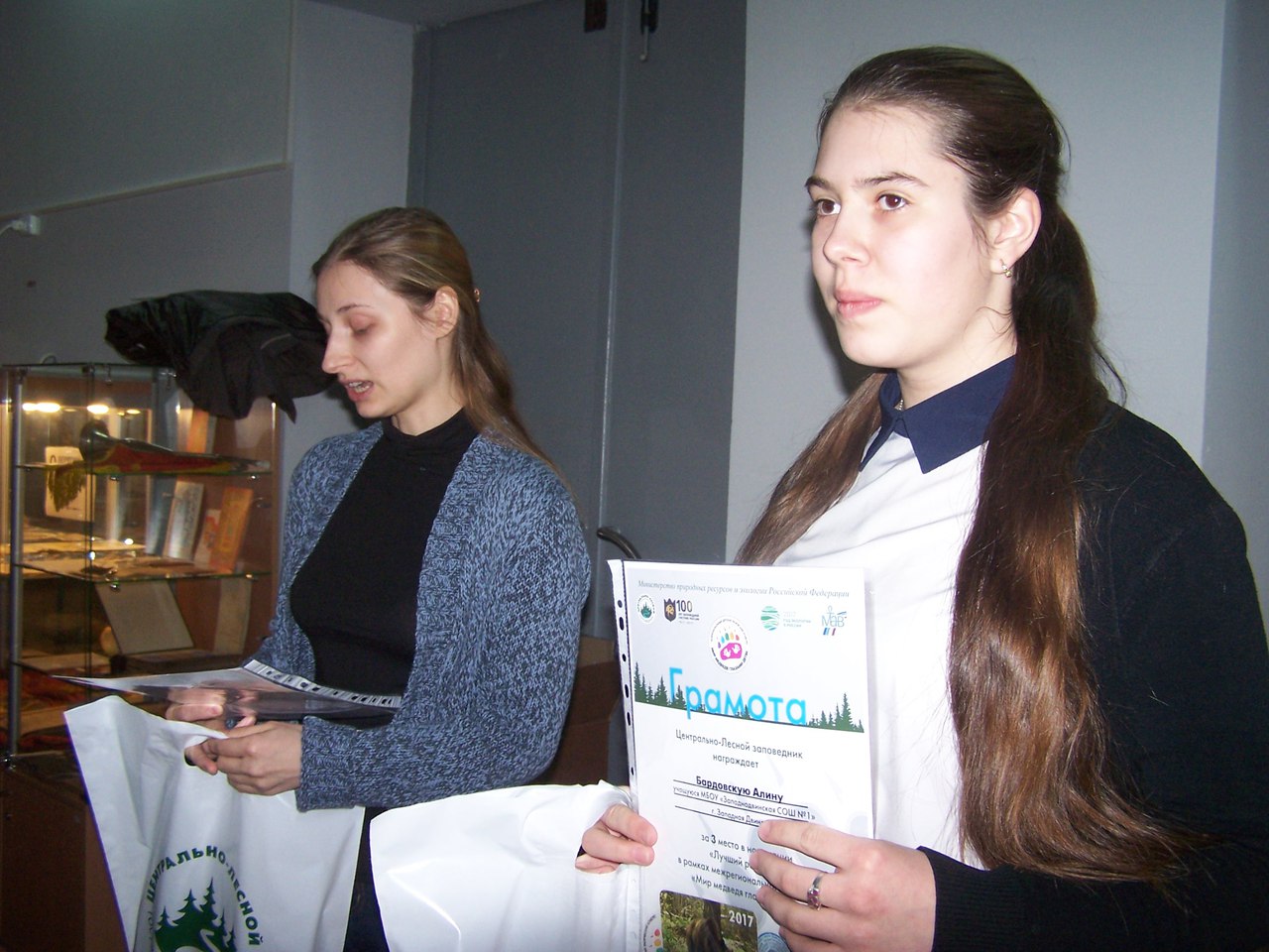 Для учащихся 5в класса МБОУ « СОШ№1» и 4б класса МБОУ» СОШ№2» сотрудниками отдела экологического просвещения была проведена экологическая беседа с показом видеофильмов и презентации о деятельности заповедника. В конце мероприятия состоялось награждение ребят, принимавших участие в творческом конкурсе «Мир медведя глазами детей». Всего в конкурсе приняли участие более 30 человек- это и учащиеся школ и воспитанники детских садов «Светлячок» и «Петушок». Сотрудники заповедника вручили сувениры победителям конкурса и грамоты участникам.