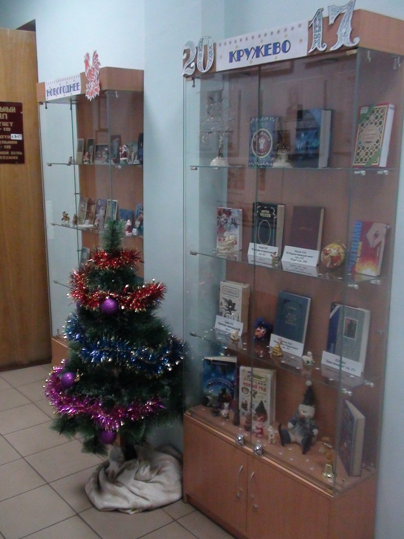 В первый день декабря библиотека представляет выставку новогодних предметов "Новогоднее кружево", расположившуюся в нашем фойе.