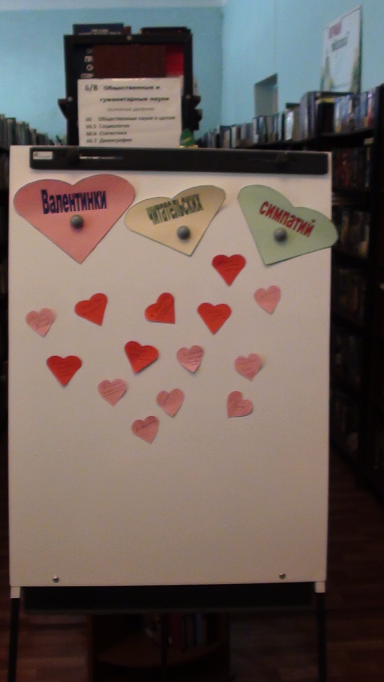 14 февраля в Центральной библиотеке прошла акция «Валентинка любимому писателю!». У читателей была возможность признаться в любви АВТОРУ и КНИГЕ, причем необычным способом. На сердечке – валентинке было предложено написать название любимой книги или фамилии поэтов и писателей. Для этой цели были выбраны самые многолюдные и открытые места в городе, – центральная площадь и городской парк. Ответы были разные: Пушкин А.С., Бунин И., Полякова Т., Д. Мойес, Э.Золя, К. Маккалоу, Ж.Санд и многие другие.