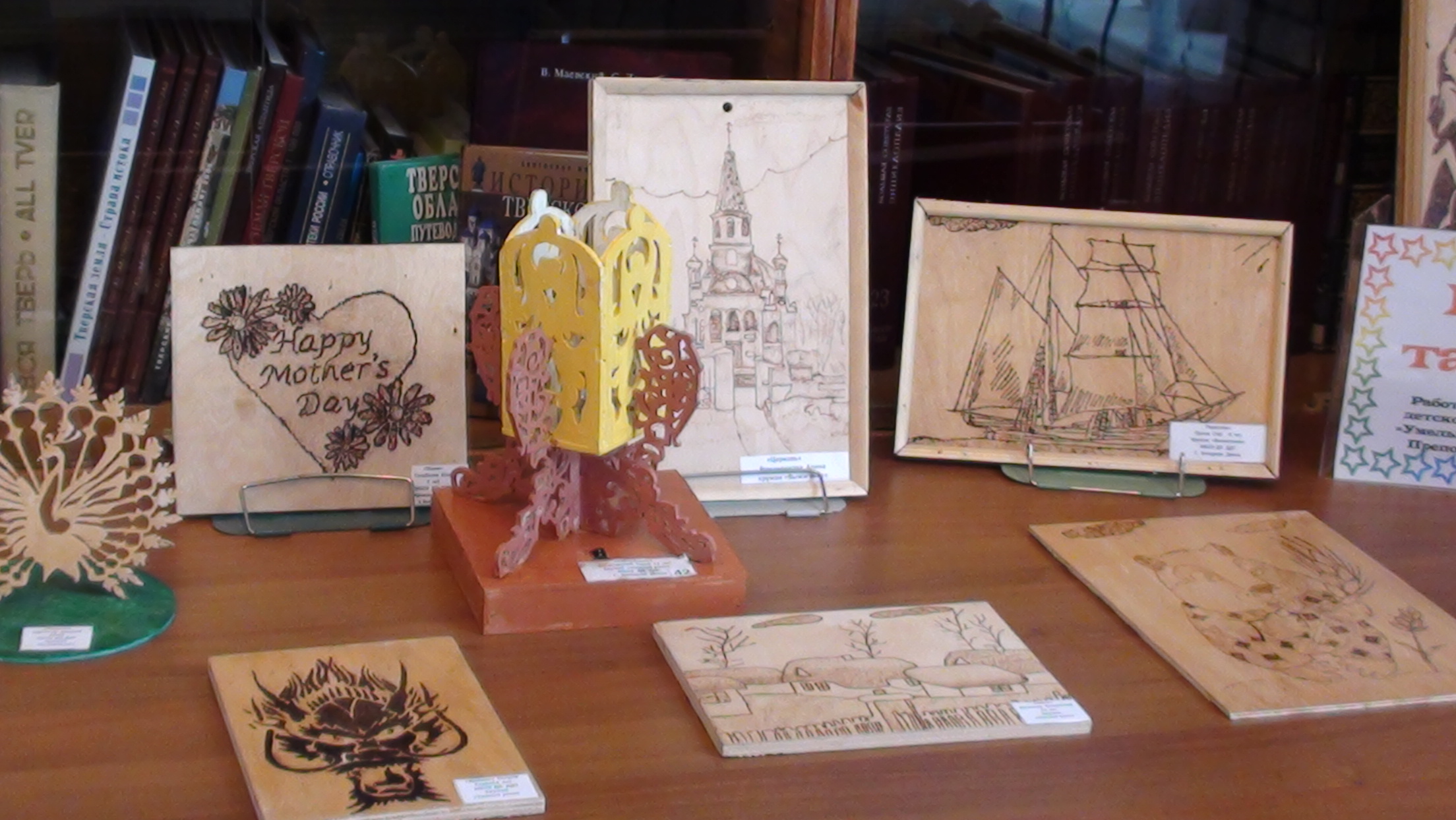 В читальном зале Центральной библиотеки проходит выставка декоративно – прикладного искусства. На ней представлены работы, сделанные в технике пирографии, то есть выжигания.