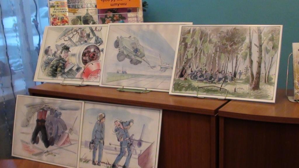 В этот день в библиотеке вниманию читателей представили выставку рисунков подполковника ВВС Валерия Медведева, который является автором иллюстраций к книге Владимира Юринова «На картах не значится».