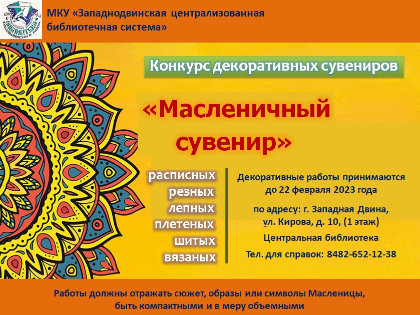 Центральная библиотека приглашает всех желающих к участию в творческом конкурсе «Масленичный сувенир». В конкурсе участвуют декоративные панно с сюжетом, образами и символикой Масленицы. Работы могут быть выполнены в любой технике рукоделия - лепка, роспись, лоскутное шитье, вязание, плетение и др. Приветствуется компактные панно не превышающие 40 см в диаметре, форма исполнения любая. Работы принимаются до 1 марта 2022 года по адресу: Центральная библиотека, г. Западная Двина, ул. Кирова, д. 10