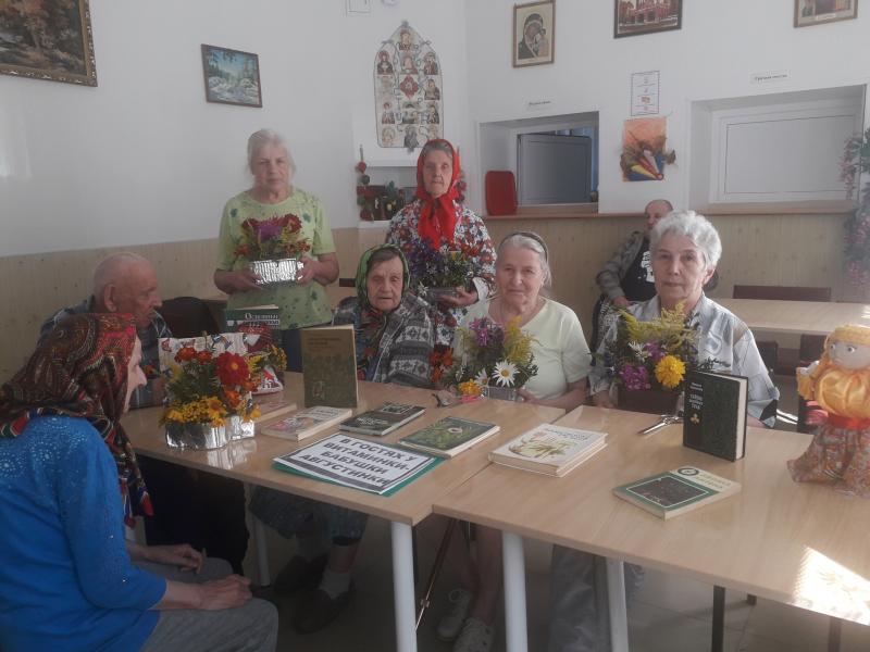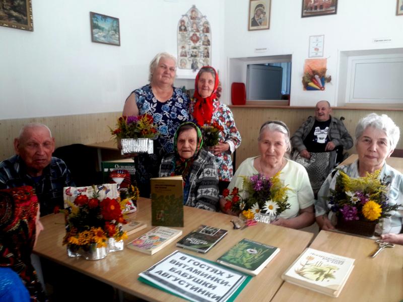 0 августа Староторопская библиотека отправилась в гости в стационарное отделение дом интернат для престарелых и инвалидов , чтобы вместе с проживающими бабушками и дедушками встретиться с озорной девчонкой Витаминкой и бабушкой Августинкой на лесной полянке. Говорили мы о лекарственных травах, ягодах, овощах и фруктах в которых большое богатство витаминов, так необходимых для пожилых людей, играли в разные игры и отгадывали загадки - витаминки. А потом собирали цветы и травы с бабушкой Августинкой для мастер класса " Живая открытка " - подарок от нас всех односельчан на день рождение поселка - 125 лет Старой Торопе. Живая открытка - это букет из живых цветов, картона, флористической губки и прекрасного настроения.  " Цветами улыбается земля" - Выставка работ проживающих дома интерната и рисунков детей детского сада на дне поселка, подготовленная библиотекой.