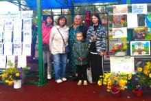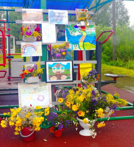 Вторая выставка была не менее интересная - "Цветами улыбается земля" - Букеты цветов ( Живая открытка) от бабушек и дедушек стационарного отделения дома интерната для престарелых и инвалидов и букеты садовых и полевых цветов от читателей библиотеки, украсили выставку рисунков детей детского сада " Валдай" - Подарок к юбилею поселка.