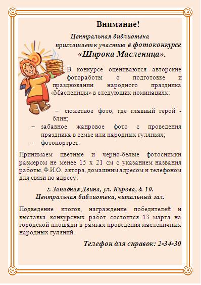 Библиотека объявляет конкурс фотографий на тему Масленицы. Принимайте участие, призы ждут своих победителей. Подведение итогов конкурса 13 марта в рамках масленичных народных гуляний.
