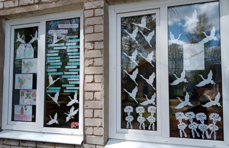 Библиотека приняла участие в акции «Окна Победы». Читатели совместно с библиотекарем украсили окна библиотеки.