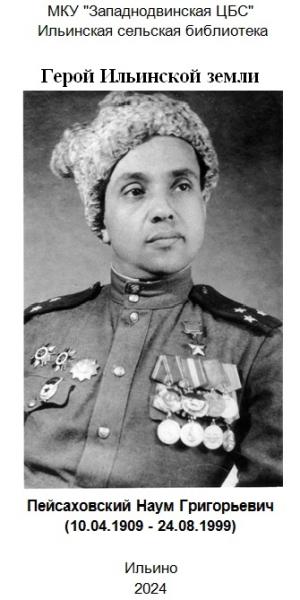 "Герой Ильинской земли" под таким названием в библиотеке проведена беседа о Пейсаховском Науме Григорьевиче. Он родился 10 апреля 1909 года в селе Ильино Западнодвинского района. После революции семья переехала в Казань. Работал инструктором школы ФЗУ. В 1934 году по партийной мобилизации призван в Советскую Армию. Находился на фронте с начала войны. После переподготовки в Академии имени М.В. Фрунзе - командир 164 полка 33 стрелковой Холмской Краснознамённой дивизии. За боевые подвиги на фронтах Великой Отечественной войны Наум Григорьевич Пейсаховский награждён орденами Красного Знамени, Кутузова lll степени, Отечественной войны l и ll степени, медалью "За отвагу", а также другими медалями. 31 мая 1945 года ему присвоено звание Героя Советского Союза. Библиотекари раздали буклеты участникам мероприятия с информацией о боевом пути нашего земляка.
