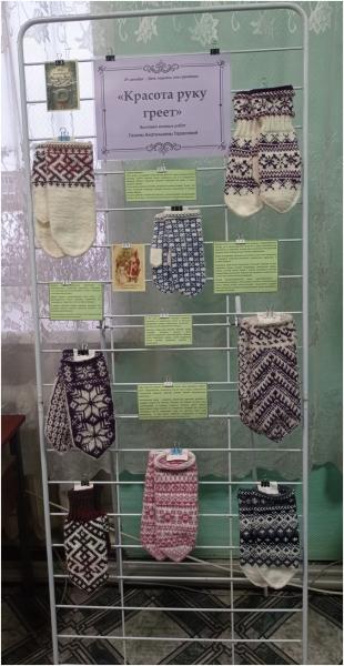 «Красота руку греет» - так называется уютная выставка изделий Тарасовой Галины Анатольевны, которая оформлена накануне Рождества и Нового года в детской библиотеке. Воистину говорят: талантливый человек – талантлив во всем. Галина Анатольевна нас удивляет своим талантом уже не первый год. На выставке представлены вязаные варежки, с разными узорами. Все рукавички связаны из натуральной шерсти, и орнаменты на них традиционные – геометрические. Традиционные орнаменты на варежках несут закодированное послание. Так, розы символизируют молодость, расцвет. Ромбы на рукавичках вывязывали, чтобы привлечь богатство, чтобы земля давала хороший урожай.