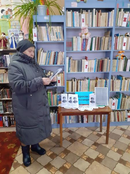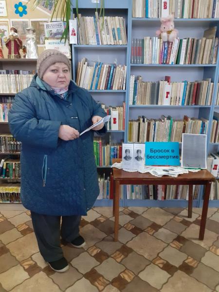 5 февраля 100 лет со дня рождения человеку, совершившему беспримерный подвиг в годы Великой Отечественной войны. Александр  Матвеевич Матросов — Герой Советского Союза, рядовой пехоты. Это он закрыл своей грудью амбразуру немецкого дзота. Ценою своей жизни он содействовал выполнению боевой задачи наших бойцов. Этот подвиг стал символом мужества и воинской доблести, бесстрашия и любви к Родине. В библиотеке прошла акция "Бросок в бессмертие", посвящённая Александру Матросову. Для читателей подготовлены буклеты, рассказывающие о жизни отважного бойца.