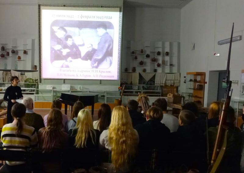 Есть в истории нашей родины великие события и даты, навечно вписанные в героическую летопись страны. Одно из них, Сталинградская битва, продолжавшаяся с 17 июля 1942 года по 2 февраля 1943 года. В Историко-краеведческом музее это событие было отмечено часом истории «Сталинградская битва» из Цикла мероприятий «Шаги Великой Победы».