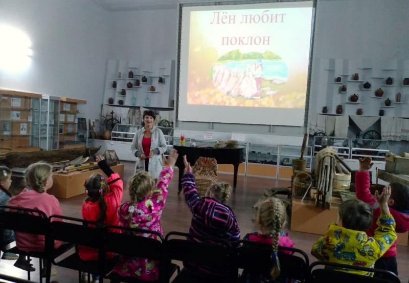 Загадывая старинные загадки, методист музея приоткрыла ребятам тайну глубокой старины, поведала о предметах быта, одежде, традициях наших предков, рассказала о том, как в старые времена люди изготавливали себе одежду из льна. Столетиями лён, как и хлеб, был для крестьян важнейшей сельскохозяйственной культурой. Лен выращивать нелегко. Очень трудоемким был весь этот процесс, много времени нужно было затратить, чтобы из семени льна получилась рубаха. Ребята узнали, как появляется одежда, посмотрев мультфильм по рассказу К.Д. Ушинского «Как рубашка в поле выросла». Детям наглядно представили полный цикл работ, связанных с возделыванием льна, обработкой волокна, изготовлением ткани, отбеливанием и пошивом одежды. Дети с интересом рассматривали музейные экспонаты, с помощью которых когда-то обрабатывали лён, пряли пряжу, ткали полотно, а также сами семена льна, из которых не только выращивают растение, но и получают целебное масло. Сложный многоступенчатый процесс превращения растения в одежду глубоко вошел в народную память, напоминая о себе пословицами, поговорками и песнями. О них поговорили в заключении мероприятия.