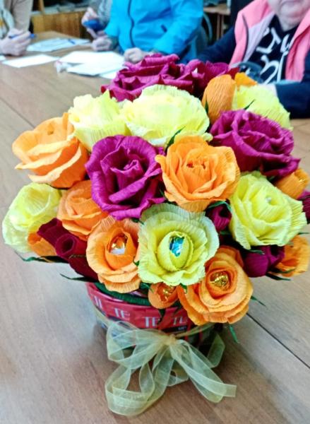 «Осеннее настроение» - так можно назвать букет, созданный руками рукодельниц клуба «Надежда» при КЦСОН в ходе мастер-класса в Библиотеке. Под руководством библиотекаря они освоили интересную технику складывания гофрированной бумаги, а итогом занятия стал оригинальный подарочный букет. Внутри каждого бумажного цветка находится конфета, что делает букет не только декоративным, но и практичным подарком.