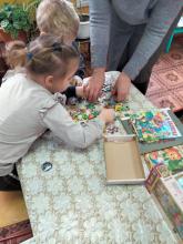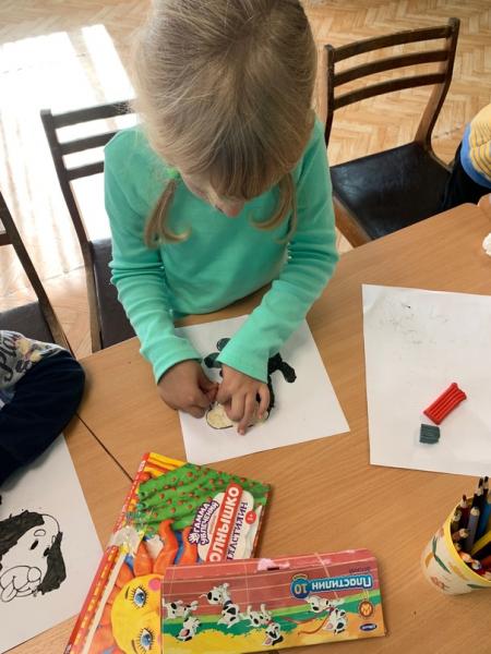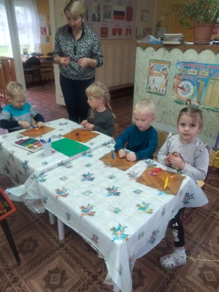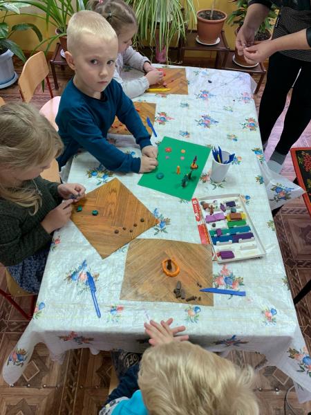 А в завершение все вместе лепили свою полянку, где растут деревья, цветы, грибы и ягоды, гуляют животные и всем хорошо, и люди приходят на полянку полюбоваться природой.
