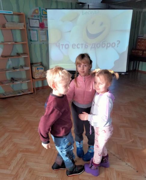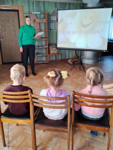 С первых минут ребята были вовлечены в интересный диалог на тему «Что такое добро, доброта?». Дети с азартом обсуждали различные ситуации, и как в них должен вести себя человек, наделённый определенными качествами добра.  Приняли активное участие в викторине, объясняли пословицы о доброте, вспоминали добрые слова вежливости, добрых литературных героев. В ходе мероприятия размышляли, что такое доброта, какого человека можно назвать добрым, какие поступки его украшают? Малыши шаг за шагом познавали законы доброты: помогай другим бескорыстно, умей вежливо обращаться с окружающими, не причиняй вреда живому на земле.Вспоминали правила доброты: жалеть других, не жадничать, не завидовать, помогать слабым и больным.