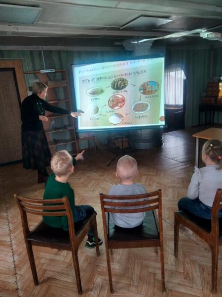В библиотеке прошла беседа и игровой час «Хлеб- всему голова». Хлеб – символ жизни, здоровья и благополучия человека. Он выделяется среди остальных продуктов, всегда ставится во главе стола, считается кормильцем. В ходе мероприятия ребята познакомились с историей появления хлеба, узнали, где растет пшеница, сколько зерен пшеницы надо вырастить, чтобы испечь один батон хлеба, как раньше люди выращивали хлеб, как убирают урожай. Было рассказано, как бережно, с уважением относились люди к хлебу на Руси в стародавние времена. Так, если хлеб случайно роняли на пол, его поднимали, целовали и просили у него прощение.Были прочитаны пословицы и стихи о хлебе. После просмотра презентации «Хлеб – всему голова», участники все вместе сделали аппликацию колосок.