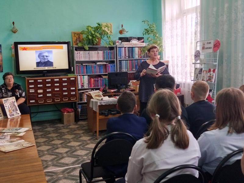 Участниками акции стали ученики 2в класса СОШ№1. Библиотекарь в своём рассказе поведала детям о том страшном времени, о мужестве, героизме советских солдат, проявленных в борьбе за освобождение нашей Родины. Затем ребятам был прочитан рассказ Сергея Алексеева "Первая колонна"