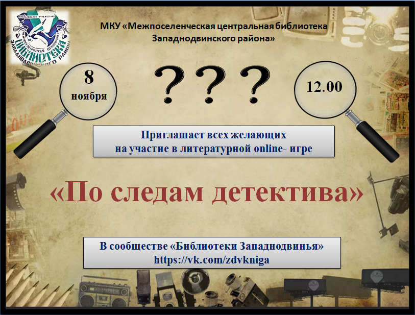 В преддверии Дня сотрудников внутренних дел России (Дня полиции) в сообществе «Библиотеки Западнодвинья» все любители детективного жанра в литературе смогут принять участие в викторине выходного дня «По следам детектива». Викторина состоится 8 ноября, в воскресение, в 12:00.
