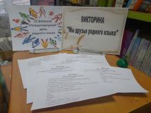 21 февраля в рамках Международного дня родного языка на абонементе для всех желающих прошла викторина "Мы друзья родного языка". Юные читатели активно приняли участие в викторине и получили сладкие призы.
