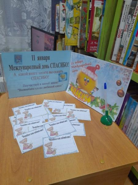 В день самого вежливого дня в году, который отмечен в календаре праздничных дат -11 января как « Международный день спасибо», на абонементе детской библиотеки прошла акция "Волшебное слово любимой книге". В акции приняли участие школьники, посетившие библиотеку в этот день.