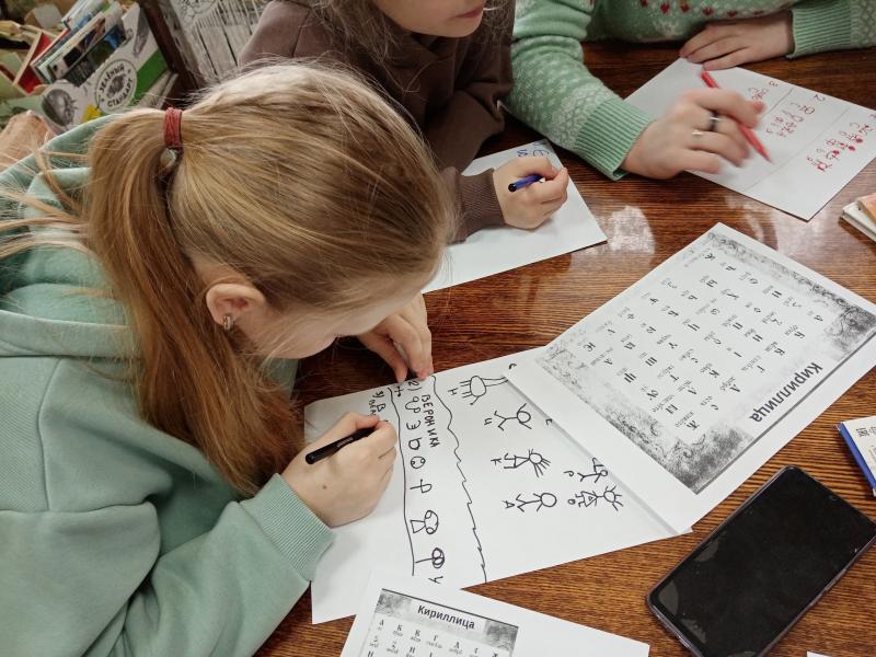 Написали свои имена, используя алфавиты пиктографии, глаголицы и кириллицы. Этот момент мероприятия привел детей в восторг.