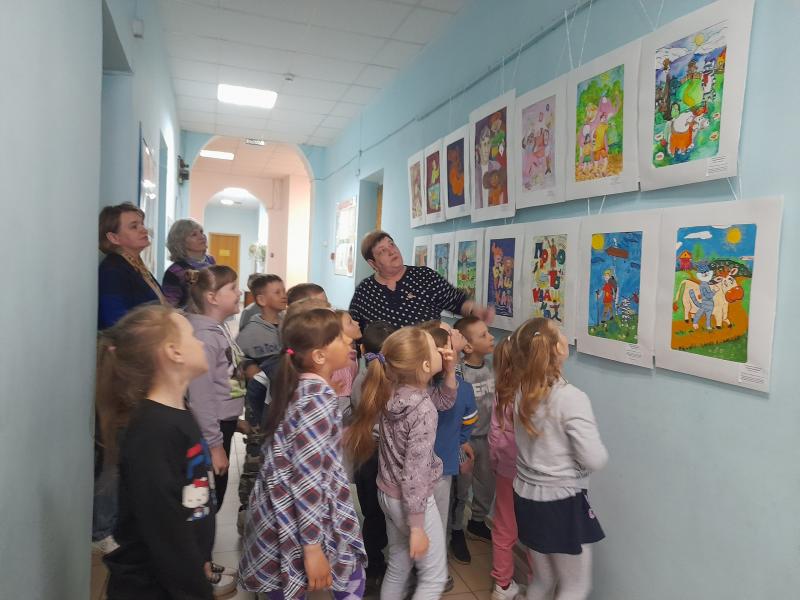 В фойе библиотеки детей встречала выставка рисунков учащихся детской школы искусств по книгам Э. Успенского. Детям загадывали загадки по картинам и конечно все герои произведений писателя были названы.