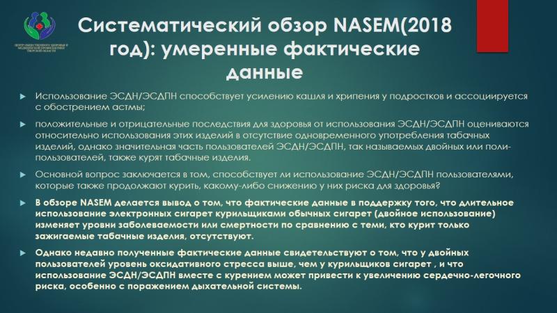 Ряд организаций общественного здравоохранения, в том числе ВОЗ, считают, что ни один из уровней воздействия вторичного аэрозоля не является безопасным или приемлемым, эти выводы явно вызывают опасения и заслуживают дальнейшего изучения.